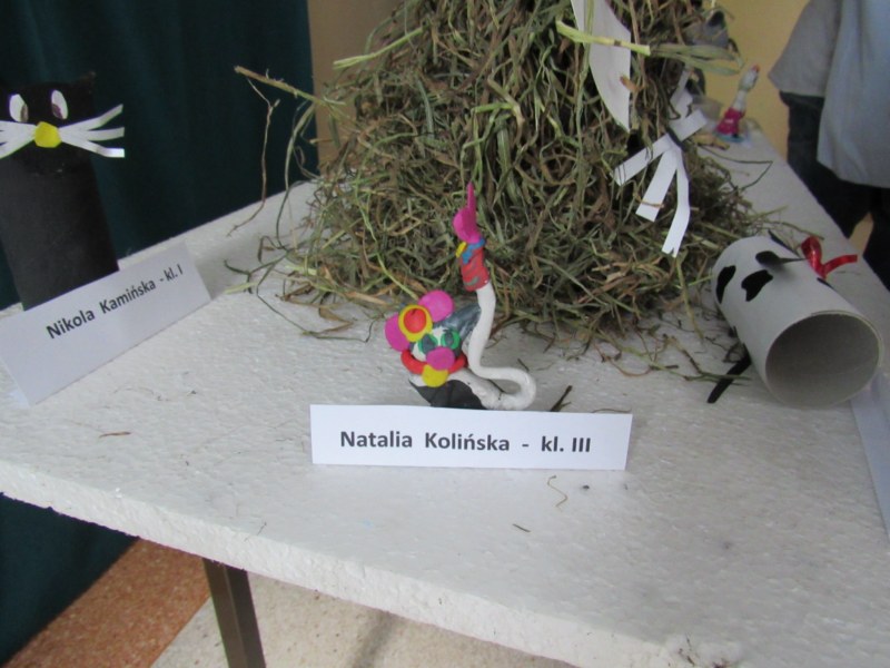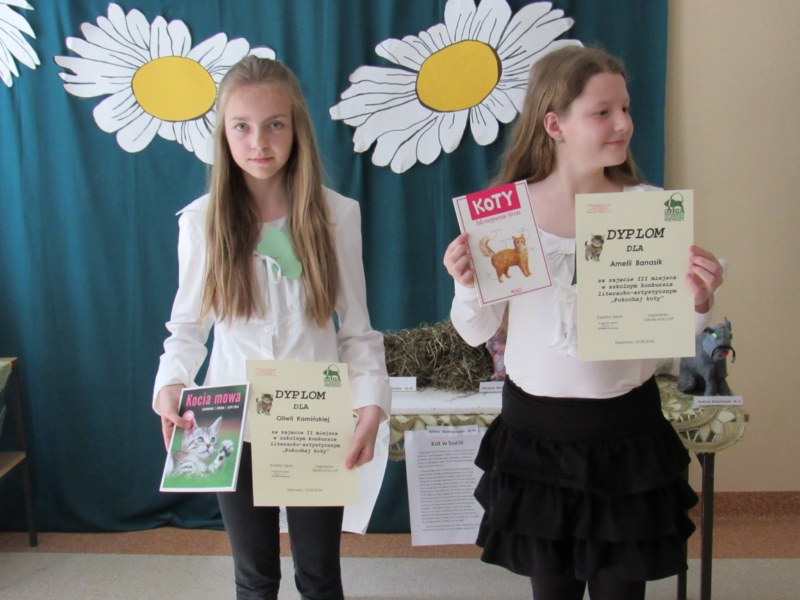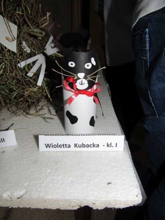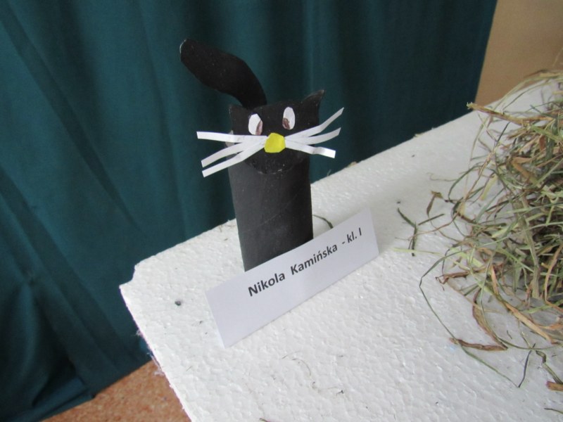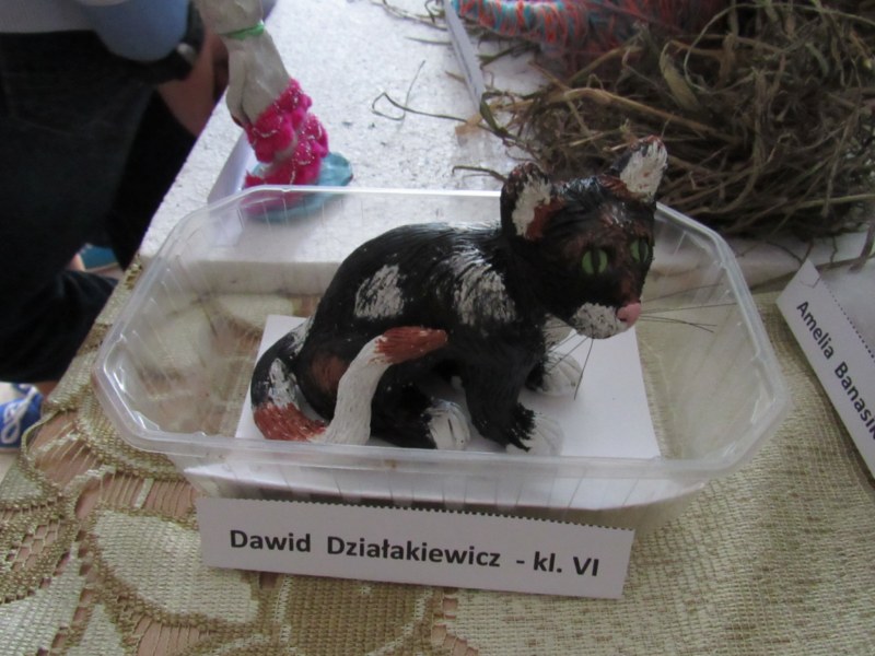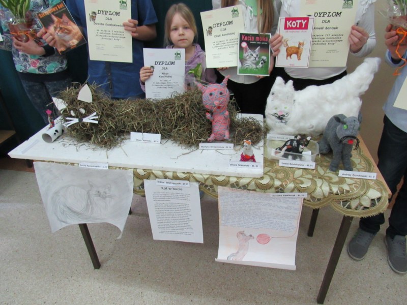 Z okazji Światowego Dnia Kota w naszej szkole odbył się konkurs literacko- artystyczny. Zadaniem uczestników było wykonanie pracy artystycznej( figura kota) lub napisanie pracy literackiej( dowolna forma). W konkursie wzięło udział 12 osób z klas I- VI. Pomysłów na wykonanie figury kota nie brakowało, bowiem były prace z plasteliny, wełny, siana, waty, materiału oraz papieru. O tym, która praca jest najciekawsza, zadecydowali sami uczniowie, oddając głos na wybraną pracę.