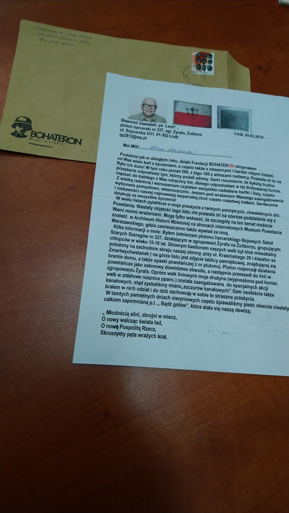 Akcja BohaterOn - włącz historię! odbyła się w październiku. W roku szkolnym 2018/2019 była to nasza pierwsza akcja, w której wzięliśmy udział. Otrzymaliśmy od organizatorów specjalne pocztówki, na których zapisywaliśmy swoje życzenia, podziękowania. Każda z osób biorących udział w akcji wybierała ze strony: www.bohateron.pl Powstańca Warszawskiego, do którego została wysłana jego pocztówka, a dwoje uczniów z naszej szkoły otrzymało nawet informację zwrotną od wybranych przez siebie Powstańców.