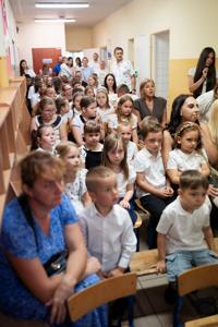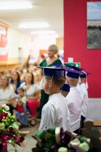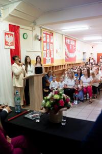Szczególnym momentem uroczystości było pasowanie na ucznia klasy pierwszej. Najmłodsi uczniowie, ubrani odświętnie i nieco przejęci, złożyli uroczyste ślubowanie przed całą społecznością szkolną. Następnie pani dyrektor symbolicznym ołówkiem dokonała aktu pasowania, oficjalnie przyjmując pierwszoklasistów do grona uczniów naszej szkoły. Było to pełne wzruszeń i radości wydarzenie, które na długo pozostanie w ich pamięci.