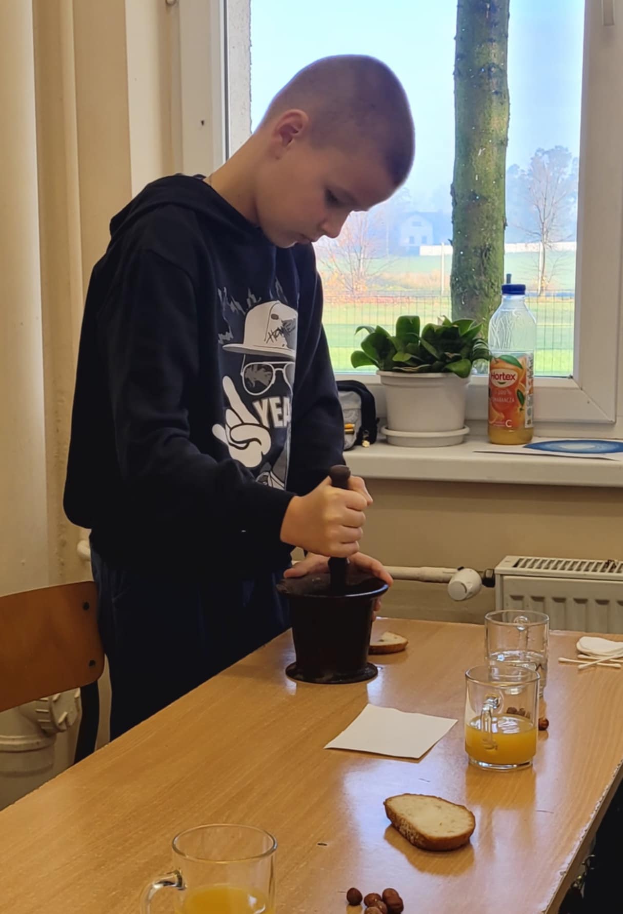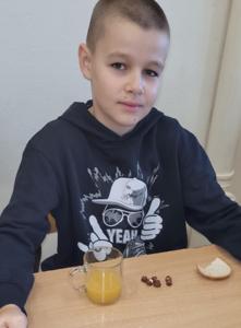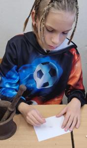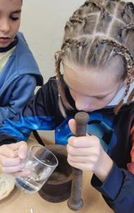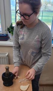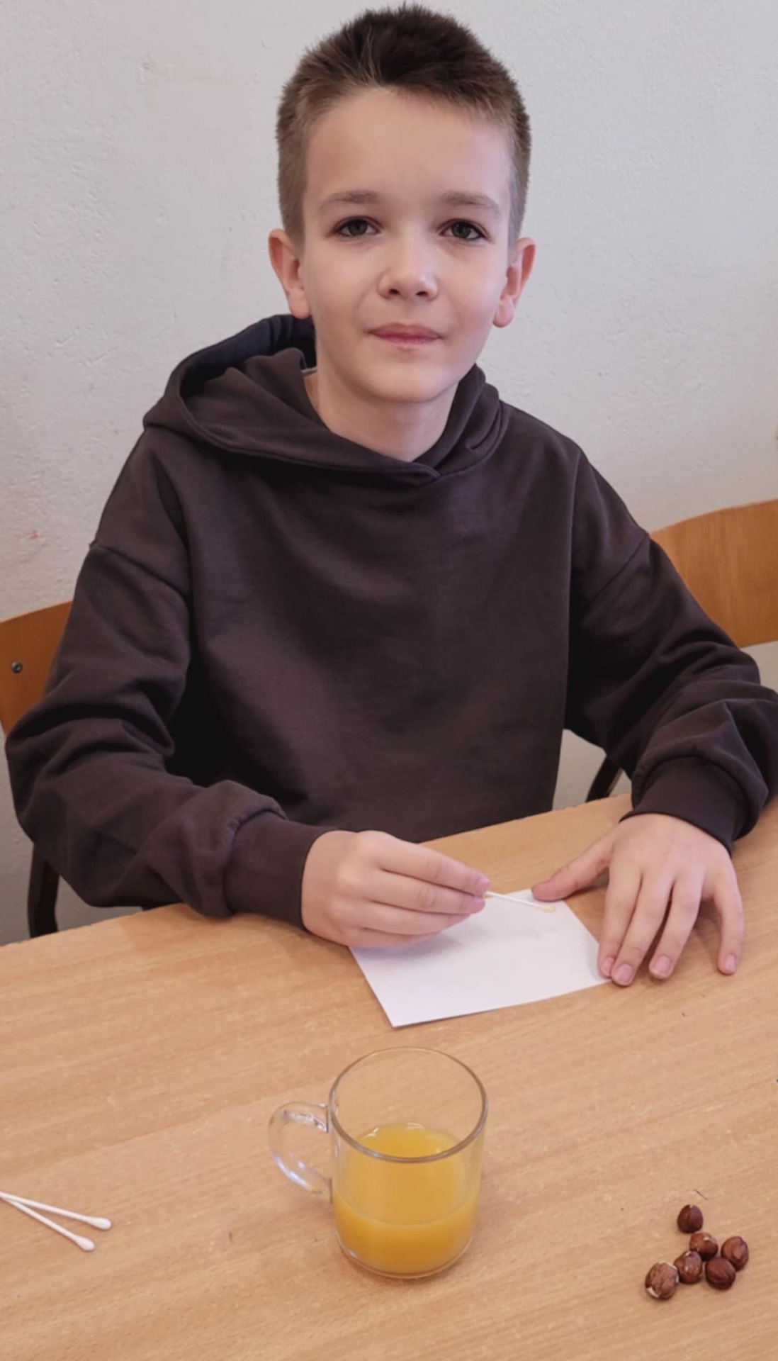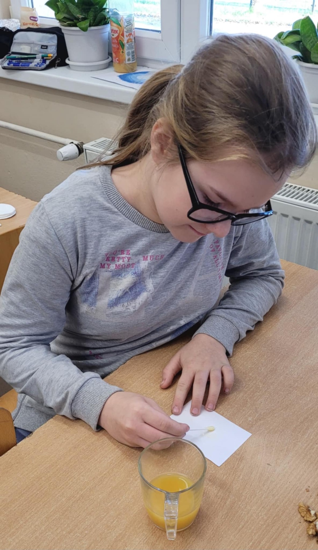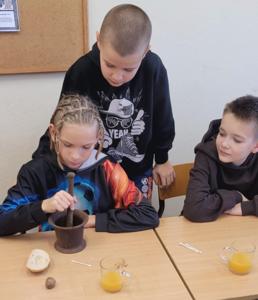 "Na tropie tłuszczy" - klasa piątka na lekcjach biologii zajmowała się wykrywaniem tłuszczów w produktach spożywczych takich jak chleb, orzechy oraz sok pomarańczowy.