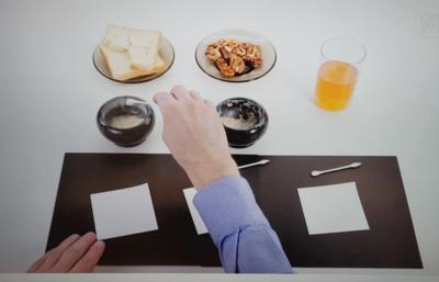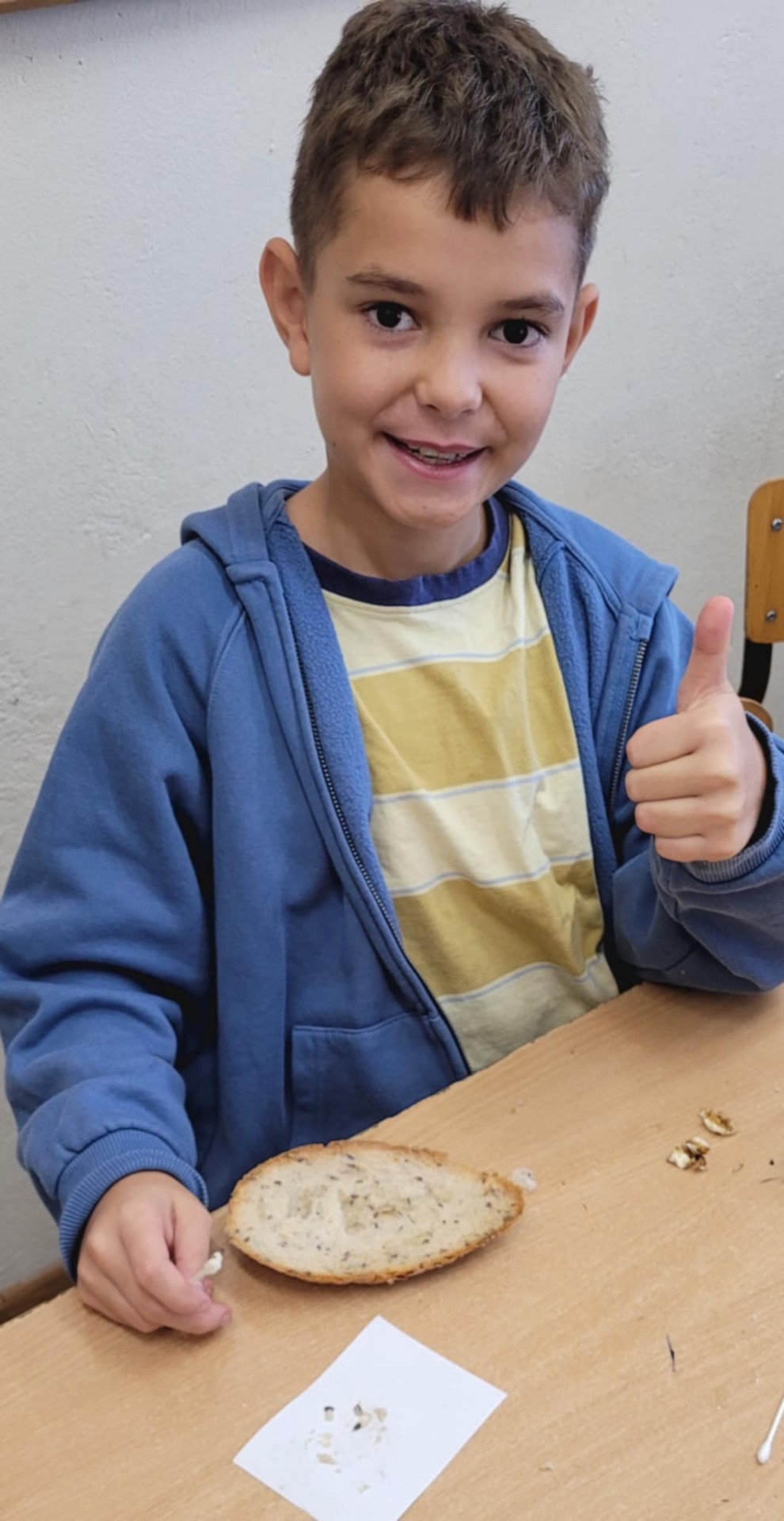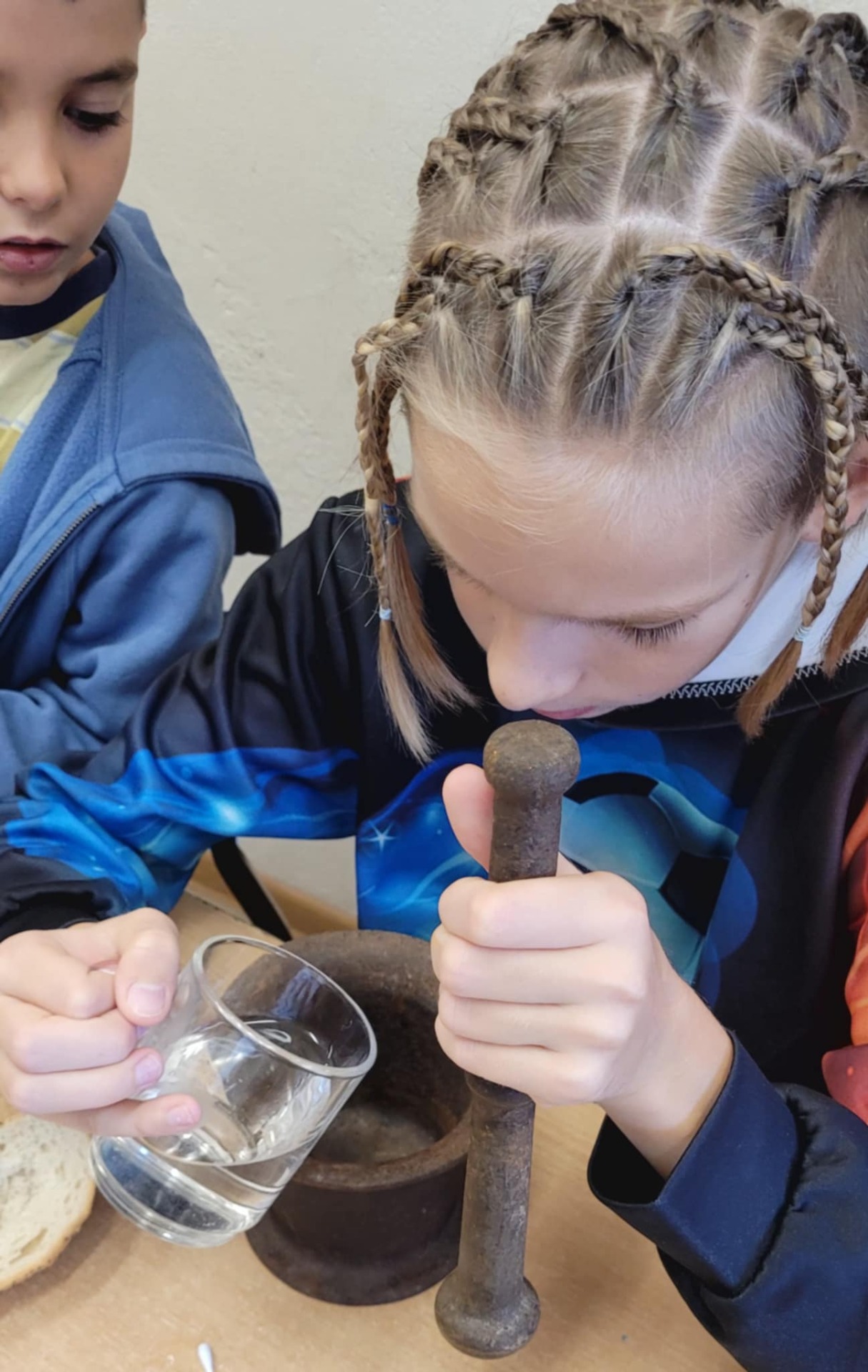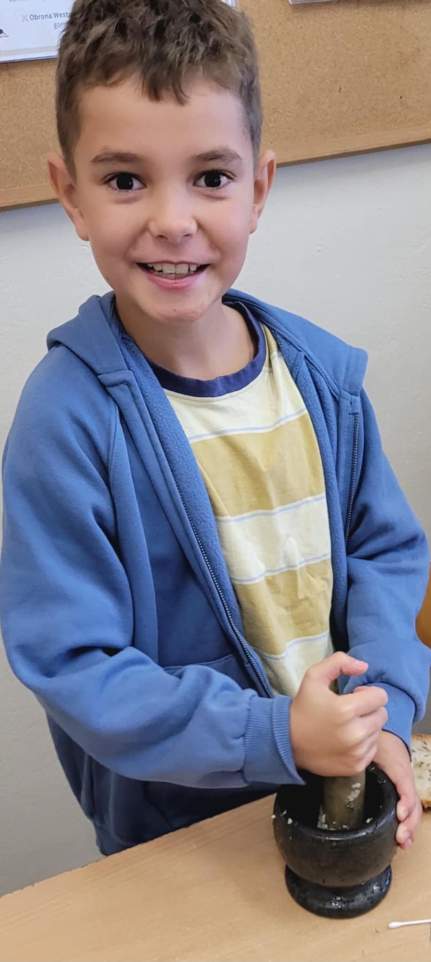 "Na tropie tłuszczy" - klasa piątka na lekcjach biologii zajmowała się wykrywaniem tłuszczów w produktach spożywczych takich jak chleb, orzechy oraz sok pomarańczowy.