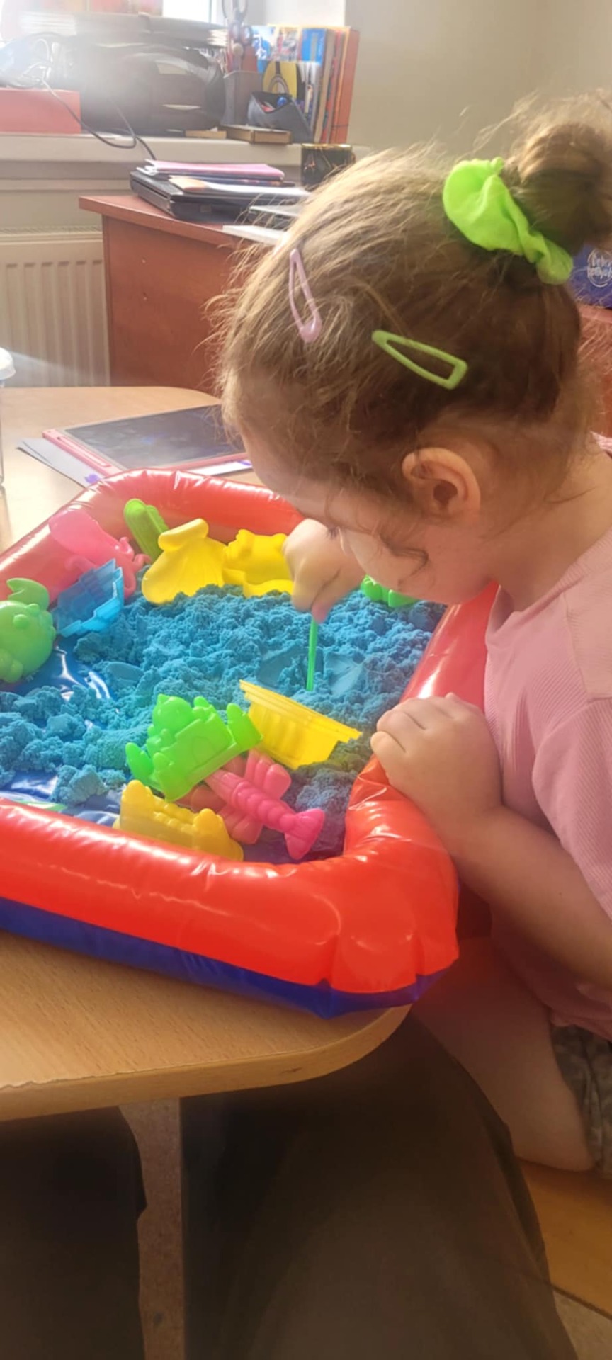 Dzieci uwielbiają bawić się w piaskownicy, jednak nie zawsze mają taką możliwość. Kolorowy piasek kinetyczny pozwala na stworzenie piaskownicy w przedszkolu. Zabawa piaskiem świetnie oddziałuje na zmysł dotyku u dziecka, a więc korzystnie wpływa na integrację sensoryczną. Dodatkowo tego rodzaju zabawy stymulują koordynację wzrokowo-ruchową i ćwiczą sprawność manualną.